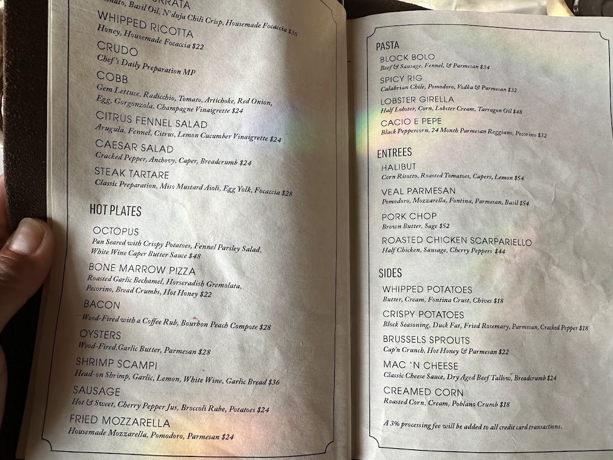 - Soups: Options such as French Onion with savory onion and beef broth, bone marrow crostini, cheese, and chives, as well as a Tomato Soup featuring San Marzano tomato, roasted garlic, shallot, basil, cream, and chicken fat croutons.