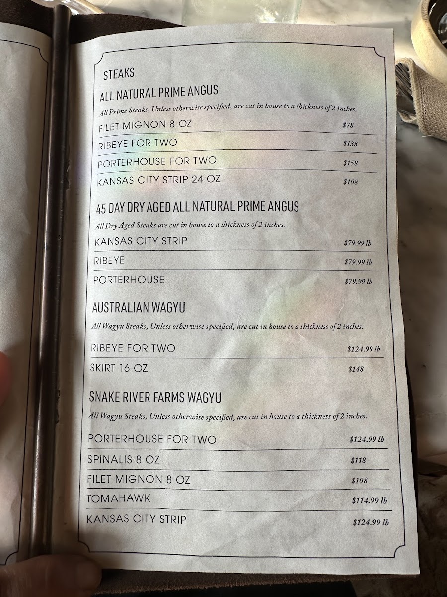 This menu is suitable for lunch and casual dining where guests can enjoy light meals or hearty servings of premium meat dishes. Visitors typically use the menu to order a range of starters, salads, pizzas, and main courses, paired with appropriate wines or cocktails.