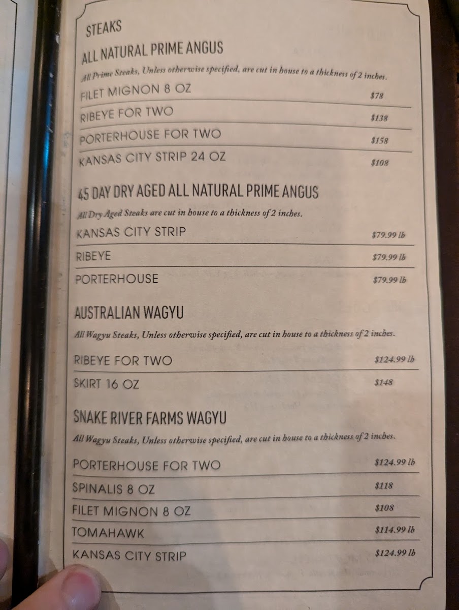 The menu also highlights specialty meat cuts such as Day Dry-Age Wagyu Porterhouse and T-Bone steaks, as well as steak portions suitable for two diners. Beverage options include selected red wines like Pinot Noir and offerings such as espresso martinis, which complement the food selections.